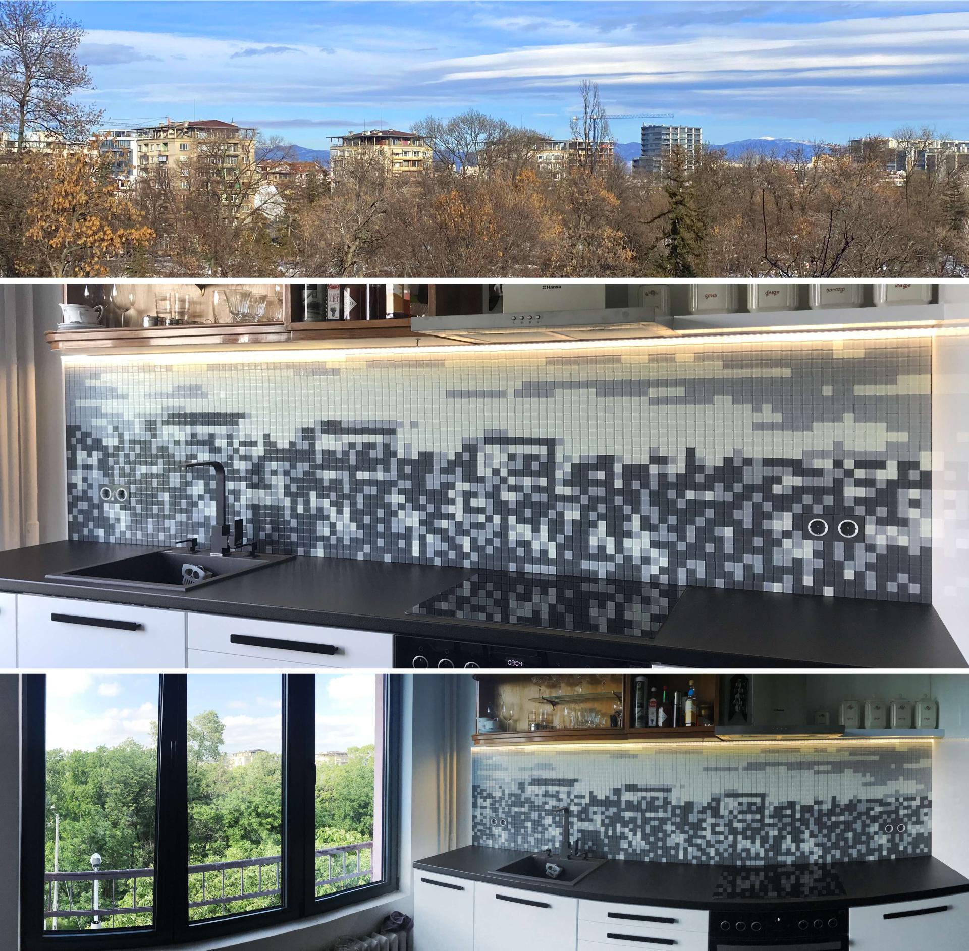 So I created a three-color mosaic based on a photo. I glued tiles on, and the image appeared.